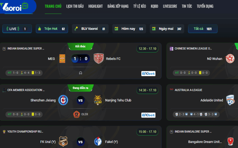 Sau khi vào trang chủ, bạn sẽ thấy danh sách các trận đấu nổi bật trong ngày được hiển thị rõ ràng cùng với thời gian thi đấu, đội bóng và giải đấu tương ứng.